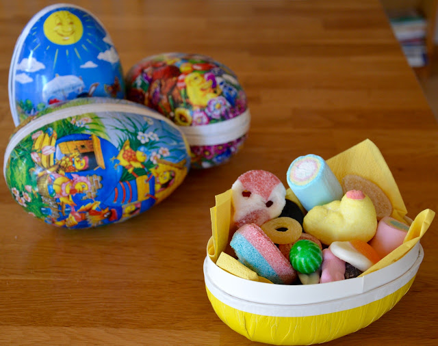 2- Transfer the candy into a colourful Easter egg, lined with half of a napkin.