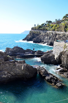 Corniglia was our second favourite. The path between Vernazza and Corniglia is very beautiful and there was something charming and special about the town's colourful houses laid on top of the cliff, contrasting with the so very blue sea. It might have helped that we stopped for a drink and some snacks in a bar that had tables and seats on a sort of balcony overlooking the sea, right on the edge of the cliff.